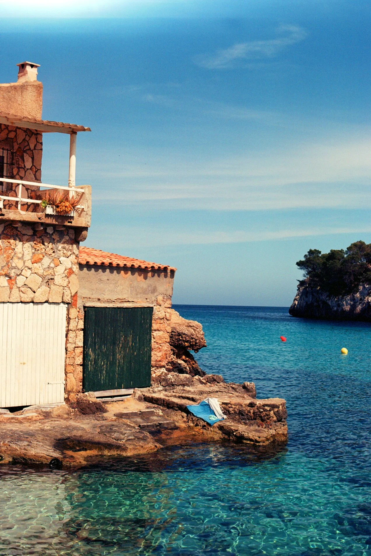 Une maison en pierre avec un balcon donnant sur la mer, rochettes et eau claire en premier plan, ciel bleu dégagé.